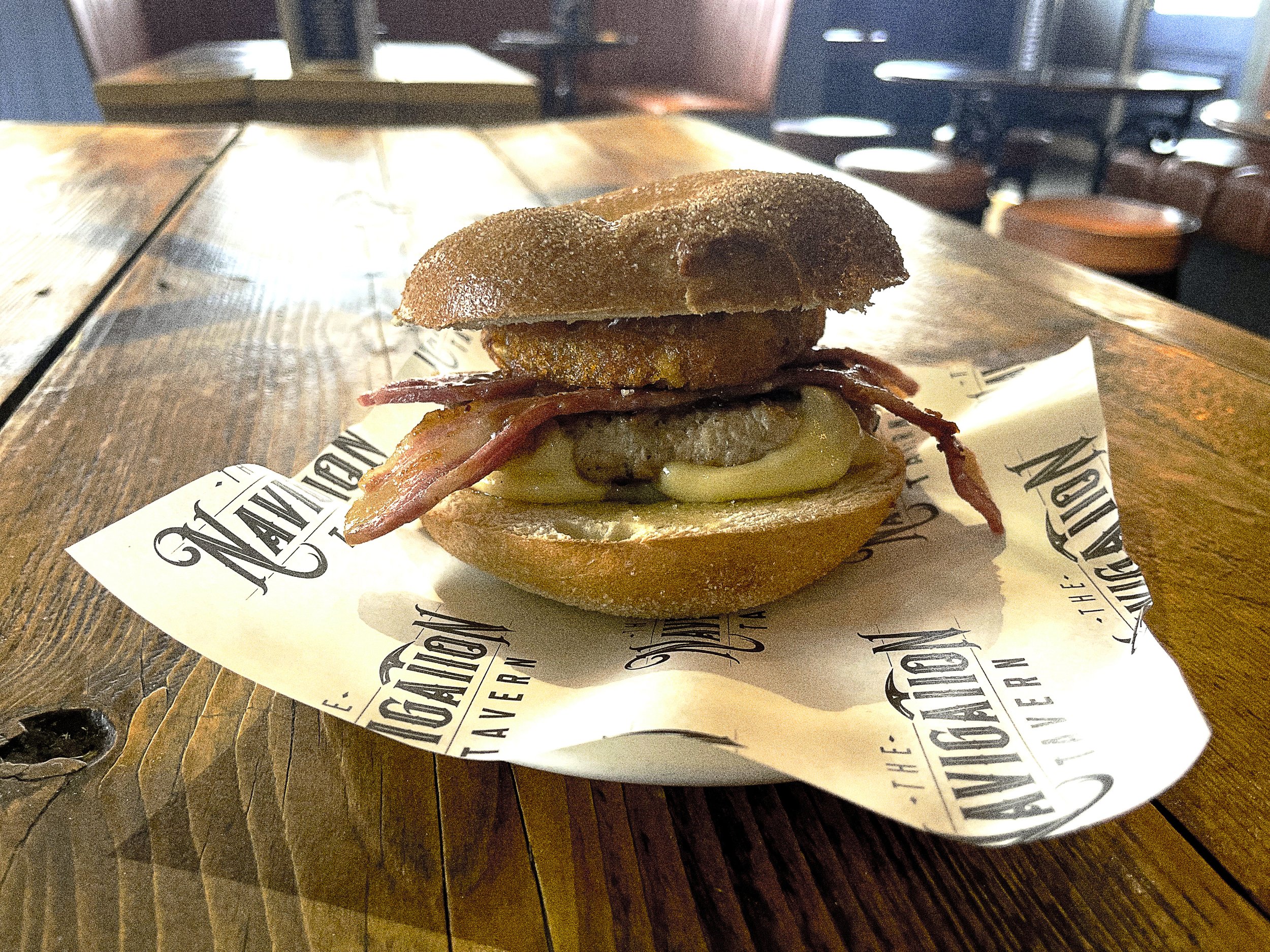 Freshly cooked bacon or sausage served in a soft white or wholemeal roll, topped with either HP Brown sauce or Heinz Tomato Ketchup.